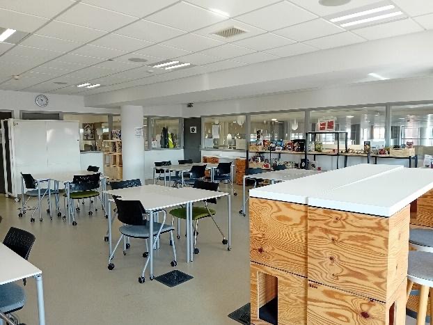 Grégor Blot-Julienne : La BU Rosalind-Franklin, située sur le campus 2 à Caen, est la plus grande bibliothèque du SCD par le nombre de places proposées. Son aménagement initial ne correspondant plus aux usages actuels, nous avons revu l’aménagement complet des espaces pour proposer une organisation qui donne à voir l’offre documentaire de la bibliothèque dans son ensemble, et qui permette différentes postures de travail. Nous avons donc réaménagé l’ensemble des salles de travail en groupe avec un équipement à la fois numérique et analogique ; ce qui a ensuite été étendu à la totalité des salles de travail du réseau. Nous avons travaillé les assises variées (vélos-pupitres, tables permettant la station debout…) afin de diversifier les postures de travail et de lecture possibles. On a souhaité aussi prendre en compte l’expérience étudiante dans sa totalité et offrir des services et des espaces qui permettent aux usagers de reconstituer leur capacité de travail et leur concentration. Lorsque nous prêtons des jeux par exemple, ceux-ci sont présentés en fonction de la durée moyenne d’une partie, ce qui permet aux étudiants de gérer leurs pauses. On propose aussi des cocons de sieste pour répondre au besoin de sommeil de certains usagers. On ne s’éloigne pas du travail universitaire, mais on tient compte de la diversification des formes de travail tout en essayant d’éviter les conflits d’usage (prêts d’ordinateurs portables, de lecteurs DVD, de modèles anatomiques, de calculatrices, de kits de géométrie… toujours en lien avec la pédagogie). Enfin, la BU Rosalind-Franklin a inauguré en octobre 2025 un fablab, qui ouvrira au public au printemps 2026. Nous nous sommes appuyés sur le Schéma directeur Vie étudiante de l’Université qui promeut l’adaptation de l’Université et de ses espaces aux différents besoins de la communauté étudiante, tout au long de la journée. C’est un projet ancien, qui a pu finalement voir le jour grâce à des crédits Contribution de vie étudiante et de campus (CVEC), et conçu avec des enseignants-chercheurs qui avaient identifié le besoin pour leurs étudiants d’accéder à un certain nombre de machines et d’équipements en dehors des heures de cours. L’idée est donc de proposer dans un espace de la BU un fablab à l’équipement identique à celui proposé par une composante du campus, mais de l’ouvrir plus largement. L’Université a par ailleurs un partenariat avec un fablab situé dans le centre-ville de Caen, Le Dôme, ce qui permet d’équilibrer l’offre dans une ville comme Caen.