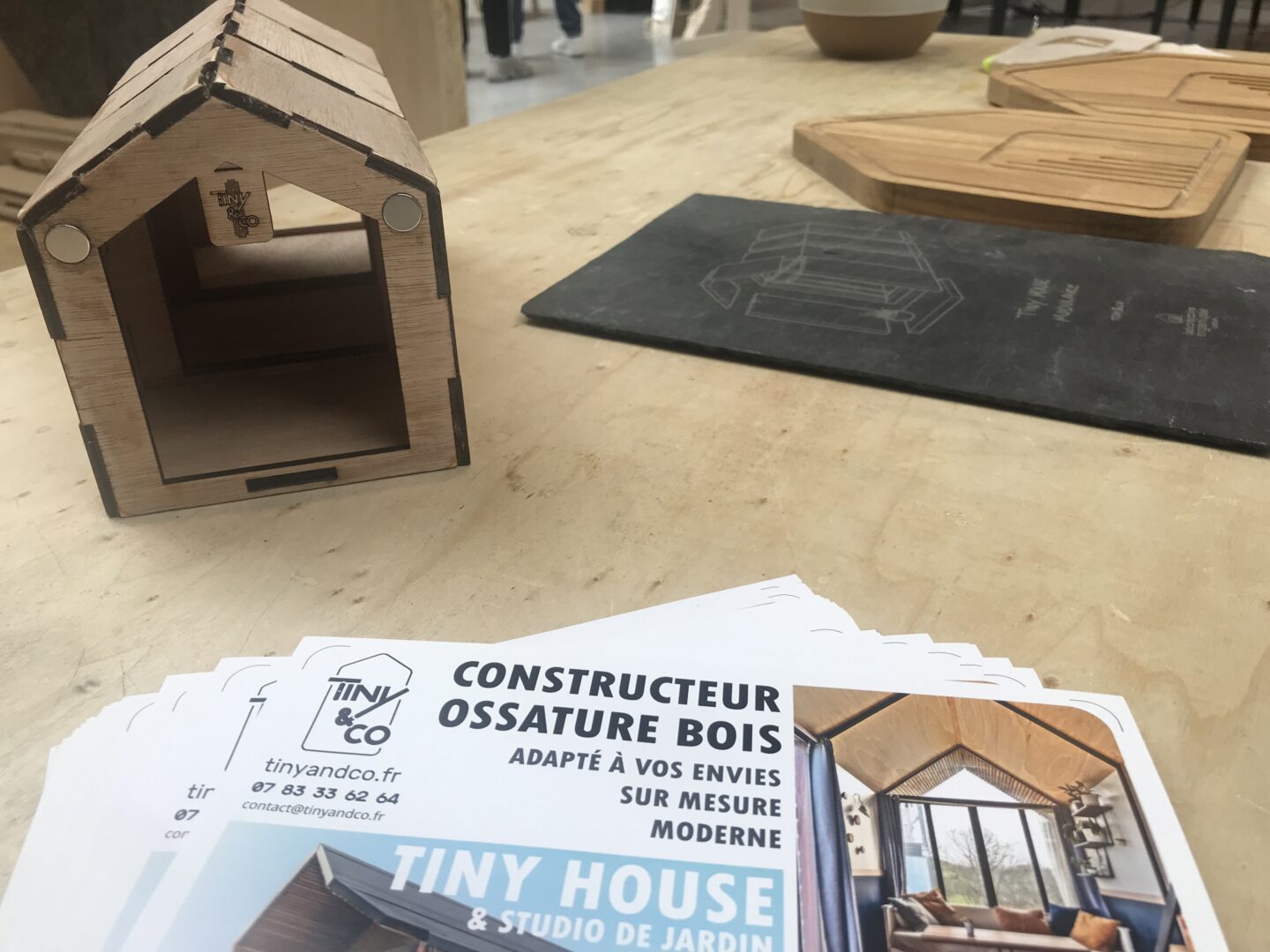 Lancée en 2022, la Manufacture Distribuée associe le bureau d’étude et collectif de makers Makers&Co, le tiers-lieu et FabLab Roselab, le tiers-lieu les Imaginations Fertiles et le Laboratoire Organique de Lustar. Elle se positionne comme « un trait d’union entre ceux et celles qui font de l’objet unique et de l’objet en série, entre l’artisanat et l’industrie, entre le manuel et le numérique pour favoriser la fabrication partagée et distribuée. » Adrien Gautier, cofondateur de la Manufacture Distribuée et de Roselab, manipule une maquette miniature des blocs qui composent les tiny houses qu’il distribue sous la marque Tiny&Co. A la manière d’un jeu d’enfant, il aimante les blocs les uns aux autres, expliquant le principe modulaire des tiny houses. Conséquence logique de son appartenance au monde des makers et des FabLabs, les éléments en bois constituant les blocs sont réalisés à l’aide d’une fraiseuse numérique et conçus pour être assemblés en toute sécurité en atelier : pas de risque de se couper, pas de travail en hauteur. « Il faut une journée en atelier pour assembler une tiny house 6m de long sur 2,5 mètres de large », précise-t-il. Les blocs sont ensuite transportés sur leur lieu d’implantation et boulonnés ensemble afin de créer une tiny house. Ce procédé de fabrication permet de faire travailler des personnes sans expérience dans la construction et éloignées de l’emploi via des chantiers d’insertion. L’aménagement intérieur et les finitions sont ensuite assurés par des artisans du bâtiment et artisans d’art locaux.